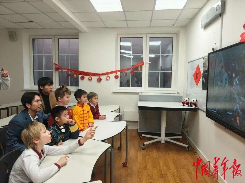 2月21日,莫斯科,“同庆中国年 感受中国风”活动在俄罗斯莫斯科剑桥国际学校举办。图为中国驻俄罗斯大使馆随员郭培帅(后排左一)陪同孩子们体验中国游戏《黑神话:悟空》。中青报·中青网驻俄罗斯记者 赵祺/摄