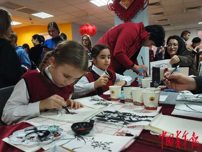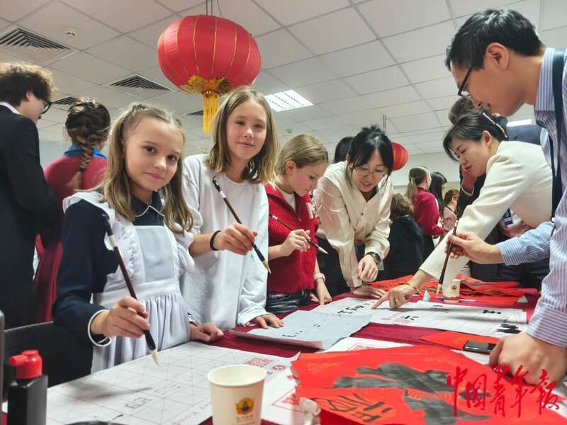 2月21日,莫斯科,“同庆中国年 感受中国风”活动在俄罗斯莫斯科剑桥国际学校举办。图为两名俄罗斯女孩在体验中国书法。中青报·中青网驻俄罗斯记者 赵祺/摄