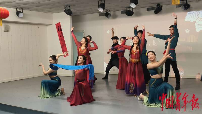 2月21日,莫斯科,在俄中国留学生为参加“同庆中国年 感受中国风”活动的现场观众献上中国传统舞蹈。中青报·中青网驻俄罗斯记者 赵祺/摄