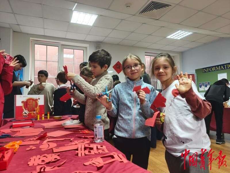 2月21日,莫斯科,“同庆中国年 感受中国风”活动在俄罗斯莫斯科剑桥国际学校举办。图为两名女孩在体验中国剪纸。中青报·中青网驻俄罗斯记者 赵祺/摄