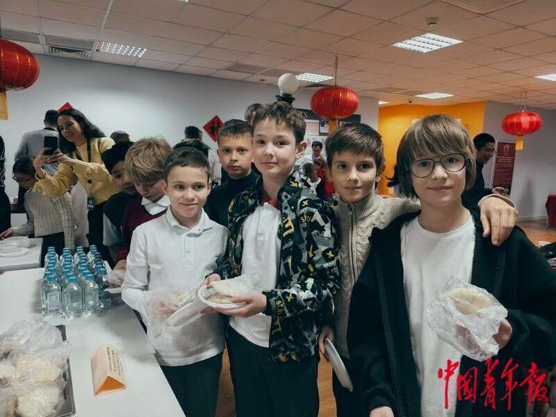 2月21日,莫斯科,“同庆中国年 感受中国风”活动在俄罗斯莫斯科剑桥国际学校举办。图为4名俄罗斯男孩准备品尝中国肉夹馍。中青报·中青网驻俄罗斯记者 赵祺/摄